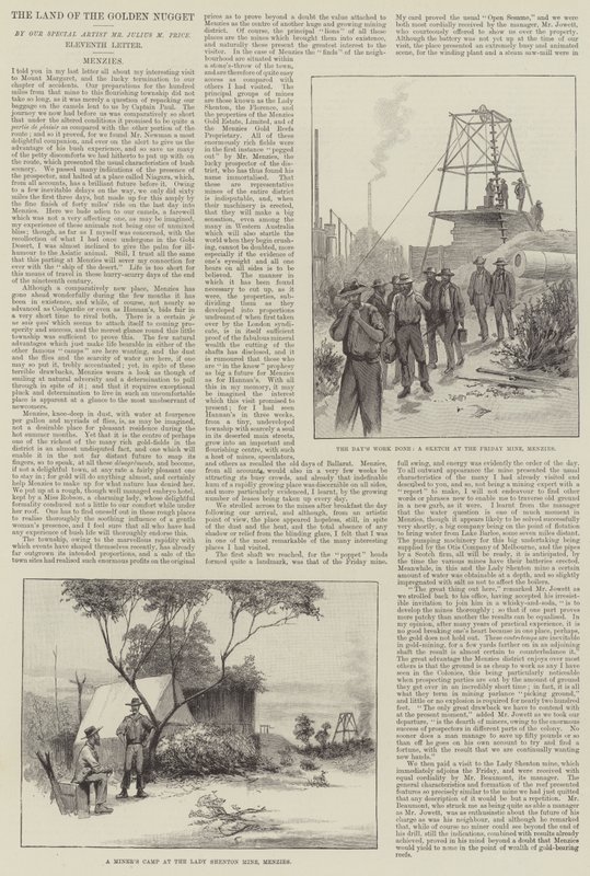 land · goldenes nugget · tagesarbeit · skizzieren · freitag mine · menzies · bergmannslager · lady shenton mine · gold schürfen · australien · goldfields esperance · Private Collection / Bridgeman Images · / Look and Learn |