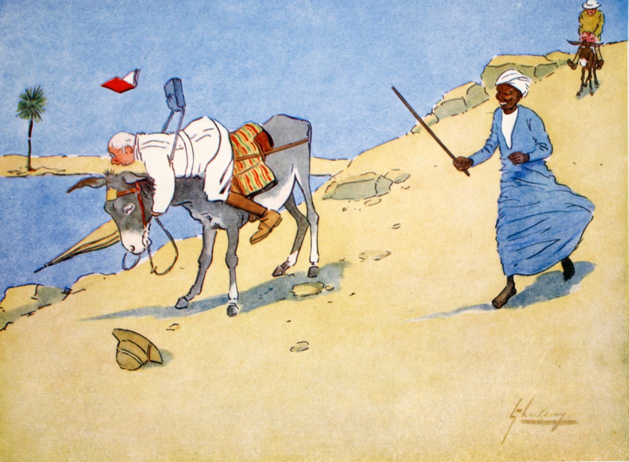 edwardian · reisen · reisende · reisende · tourismus · tourist · touristen · Ägypter · esel · wüste · fluss · araber · tracht · kostüm · buch · führer · tropenhelm · kolonialzeit · kolonialist · kolonialismus · karikatur · stock · reiten · Private Collection / Bridgeman Images