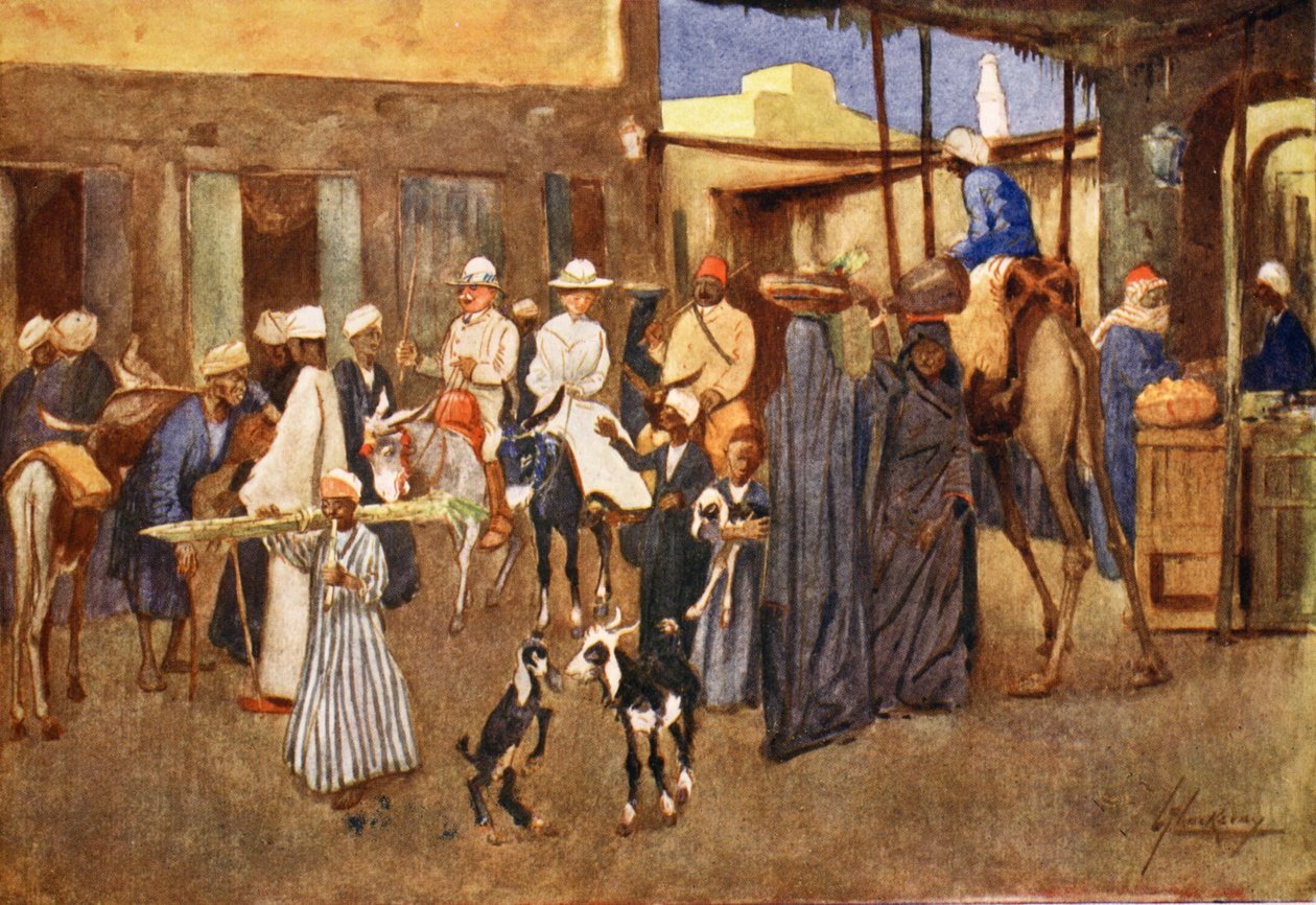 edwardian · reisen · reisende · reisende · tourismus · tourist · touristen · Ägypter · engländer · brite · esel · tropenhelm · kolonialist · kolonialismus · markt · esel · reiten · tarboosh · turban · roben · arabisch · stock · ziege · ziegen · Kamel · Private Collection / Bridgeman Images