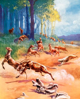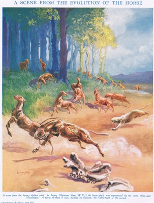 Eine Szene aus der Evolution des Pferdes(A scene from the evolution of the horse (colour litho))Leonard Robert Brightwell |