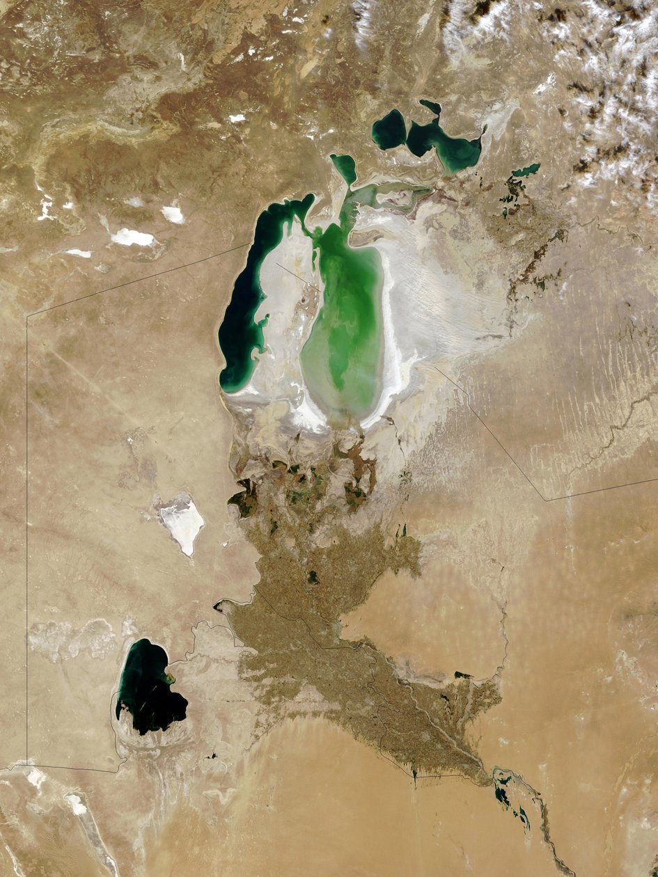 Das Aralsee, Oktober 2008. Einst viertgrößtes Binnenmeer, in Südkasachstan und Nordusbekistan, hat sich in drei Wasserkörper geteilt. Wissenschaft Geologie(The Aral Sea, October 2008. Once fourth largest inland sea, in southern Kazakhstan and northern Uzbekistan it has divided into three bodies of water. Major cause of shrinkage due to diversion of water)National Aeronautics and Space Administration National Aeronautics and Space Administration |