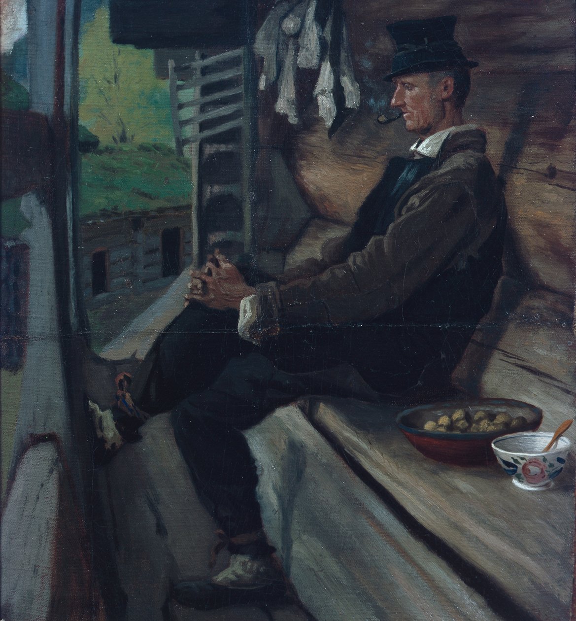 essen · rauchen · schüssel · raucher · sitzend · pfeife · bank · männlich · beine gekreuzt · malerei · mzmalerei · Private Collection / Bridgeman Images |