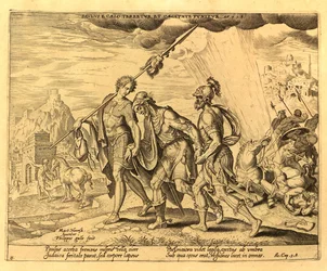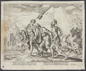Der blinde Saul wird nach Damaskus geführt(The blind Saul led to Damascus)Philips Galle,Maarten van Heemskerck(after model by),Philips Galle(publisher) |