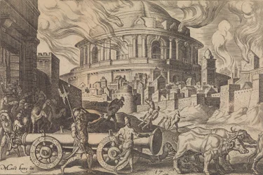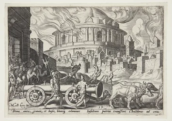 Die Chaldäer tragen die Säulen des Tempels von Jerusalem weg(The Chaldeans carrying away the pillars of the temple of Jerusalem)Philips Galle,Maarten van Heemskerck(after model by),Philips Galle(publisher) |