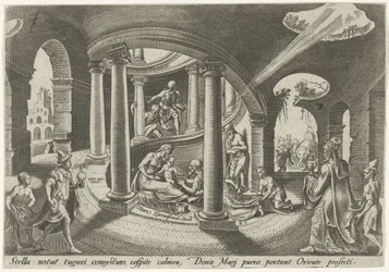 Die Rückkehr der Apostel vom Ölberg und die Wahl des Matthias zum Apostel Die Zerstörung des Tempels von Ashtoreth, Chemosh und Milcom Die Macht der Frau [3 Esdras 4:18-19, 22-23, 29-32], aus Die Vier Stärksten Mächte Die Söhne Gottes, Satan unter ihnen, stellen sich vor den Herrn Elefantenjagd Der verlorene Sohn als Schweinehirt, Gleichnis vom verlorenen Sohn König Josia lässt den Tempel von Baal zerstören Die Menschen arbeiten auf den Feldern Simson zerstört den Tempel der Philister Jona sitzt unter dem Wunderbaum (Geschichte von Jona) Titel, im Zentrum Heemskercks Porträt Die Zerstörung von Ai und die Steinigung von Achan Riviernimf Styx Wasser, aus Die vier Elemente Es ist leichter für ein Kamel, durch ein Nadelöhr zu gehen, als für einen Reichen, in das Reich Gottes zu gelangen