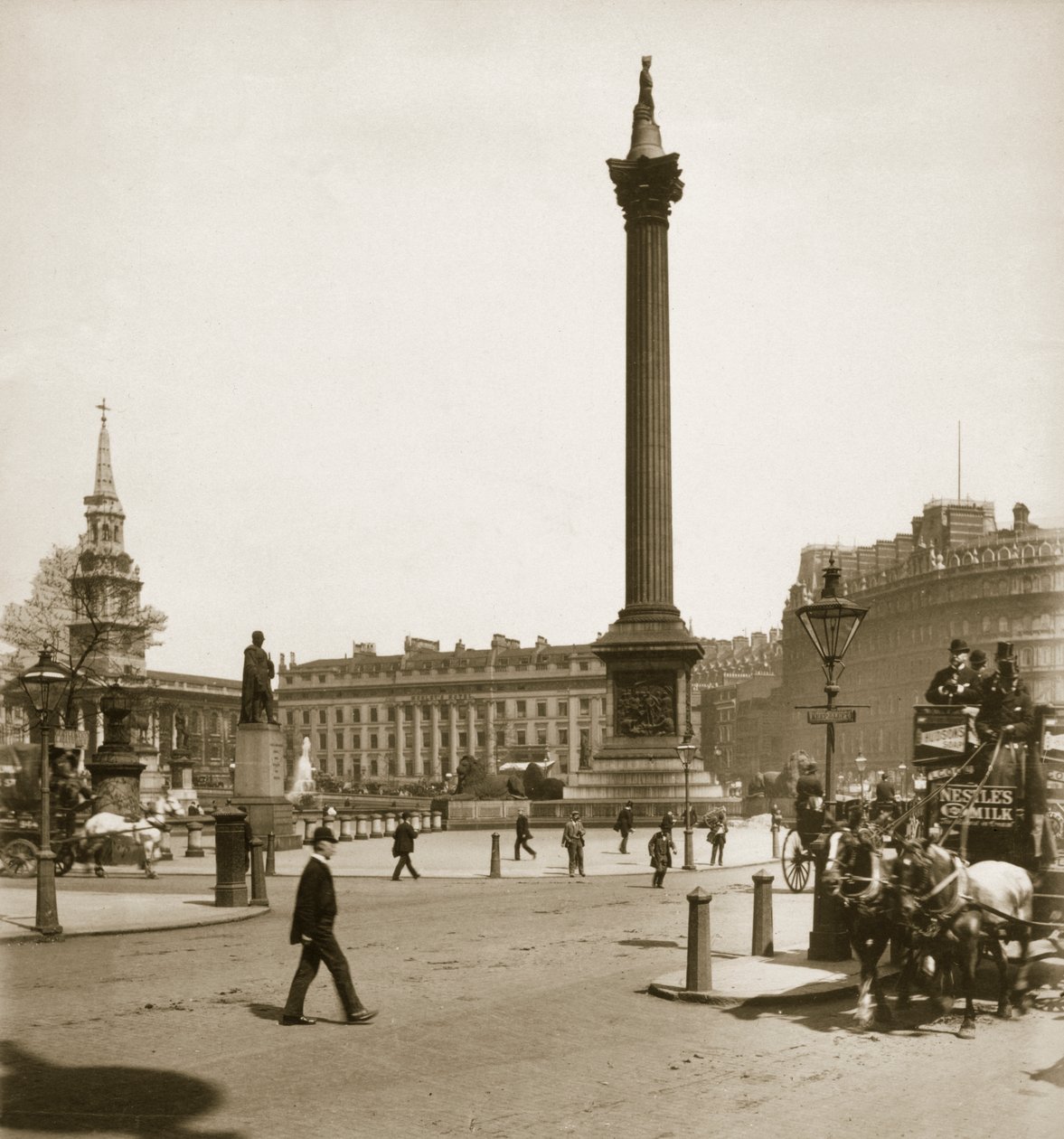 sepia · viktorianisch · fußgänger · nelsonsäule · omnibus · martin' · s in the fields · Stadt · Private Collection / Bridgeman Images