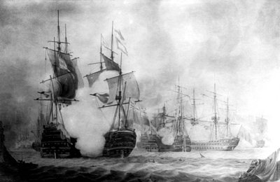transport · transport · meer · land · französisch · frankreich · rauch · schiff · schiffe · brennen · feuer · britisch · geographie · kämpfen · krieg · position · jahrhundert · großbritannien · konzept · führung · schlacht · georgisch · marine · führung inseln · guernsey · einfarbig · kriegsführung · flotte · segeln des schiffs · englische führung · marinekriegsführung · wassertransport · kriegsschiff · schwarzes u. weiß · schwarzes und weiß · 18. jahrhundert · achtzehntes jahrhundert · st georges day · aquatint · robert dodd · dodd · robert · The Print Collector/Heritage Images