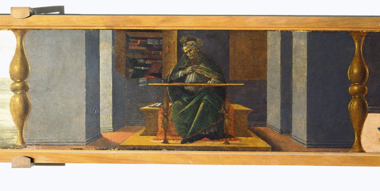 St. Augustinus in seinem Studierzimmer, Predella-Panel vom Altarbild des St. Markus, c.1488-90(St Augustine in his Study, predella panel from the Altarpiece of St Mark, c.1488-90 (tempera on panel) (see 44363))Sandro Botticelli |