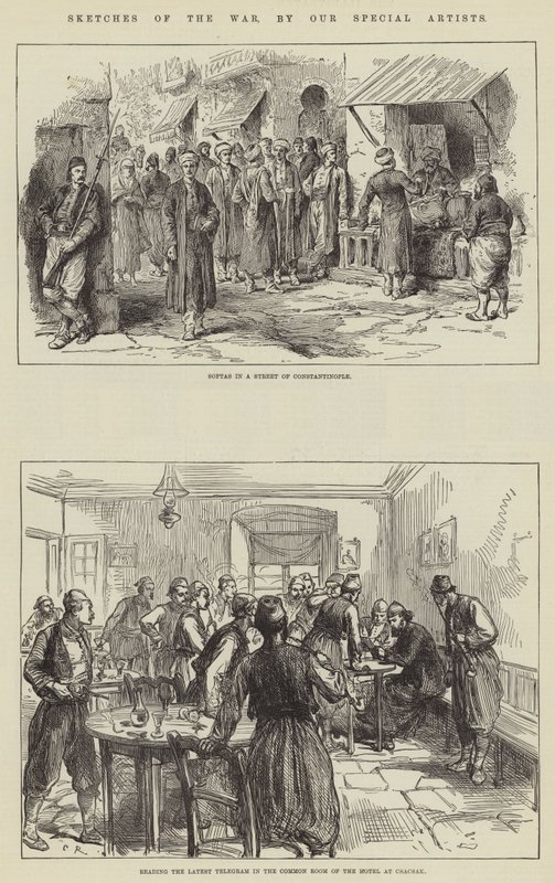skizzen · krieg · softas · straße · konstantinopel · lesen · telegramm · gemeinschaftsraum · hotel · csacsak · russisch-türkischer krieg · militär · straßenszenen · truthahn · istanbul · traditionelles kleid · Private Collection / Bridgeman Images · / Look and Learn |