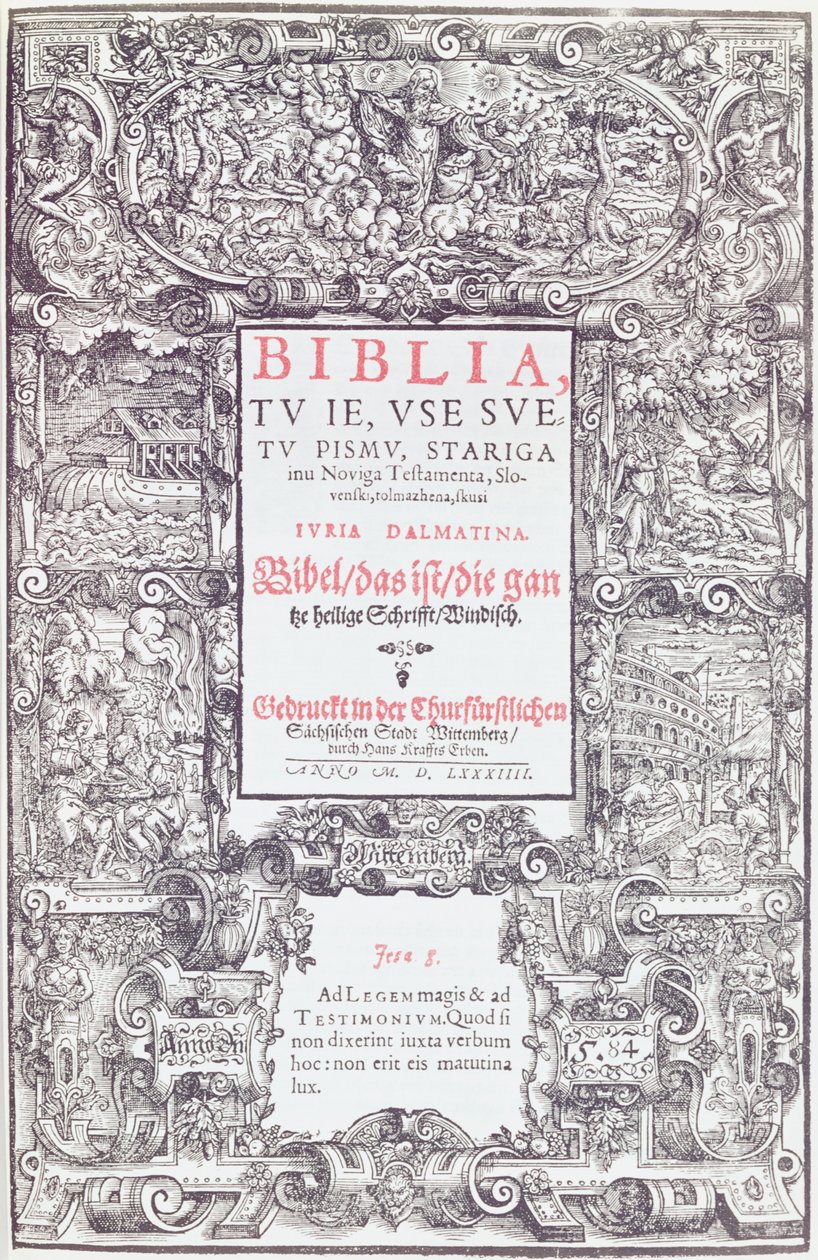 Erste Bibel, die in slowenischer Sprache gedruckt wurde, 1584(First Bible to be printed in Slovene language, 1584 (printed paper))Slovenian School |