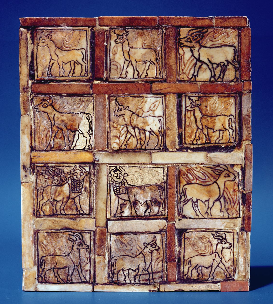 Spielbrett, das Tiere des Feldes und Waldes darstellt, aus dem Irak, ca. 2500 v. Chr.(Gaming board depicting animals of the field and forest, from Iraq, c.2500 BC (wood))Sumerian |