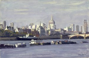 themse · brücke · pauls kathedrale · boot · boote · stadt · skyline · alltagsszene · stadt · trübe · grau · schlepper · malerei · Aquarell · Private Collection / Bridgeman Images |