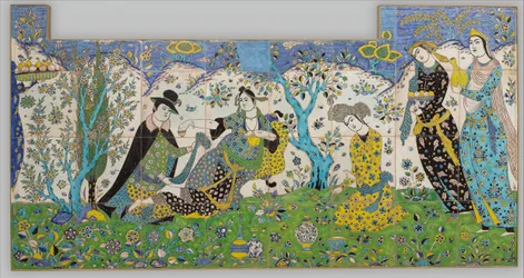 europa · freizeit · ende oben · frau · frauen · frau · leute · schwarzes · gruppe · fromm · garten · gärten · gelb · land · religion · handel · grün · kontinent · kleidung · museum · europäisch · farbe · dekoration · dekorativ · kleid · islam · islamisch · keramisch · fliese · fliesen · position · keramik · jahrhundert · kleidung · der iran · iranisch · narbe · tonwaren · kunstprodukt · nahaufnahme · kunstprodukt · kaufmann · glasiert · 17. jahrhundert · dekorative künste · farbe · getroffen · metropolitanmuseum der kunst · das metropolitanmuseum der kunst · persisch · persien · isfahan · object · unknown · ceramic · black colour · fritware · heritage art · stonepaste · stone-paste · ceramics-tiles · cuerda seca · Heritage Art/Heritage Images