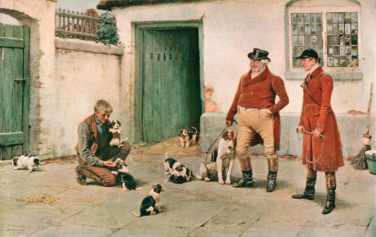 tier · landschaft · leute · mann · mann · männer · hund · kerl · britisch · farbe · farbe · welpe · welpen · jagd · position · victorian · jahrhundert · großbritannien · bewundern · konzept · 19. jahrhundert · jäger · 1900s · 20. jahrhundert · fuchsjagd · 19.jahrhundert · foxhunting · unknown · foxhounds · john charles dollman · dollman · john charles · The Print Collector/Heritage Images |