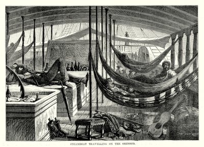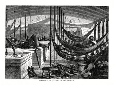 spielraum · transport · transport · fluß · südamerika · leute · mann · mann · männer · fußbekleidung · musik · künste · tropisch · kerl · schiff · schiffe · schlaf · schlafen · kontinent · kleidung · geographie · aufladung · aufladungen · plattform · kleid · passagiere · passagier · guitarre · gepäck · position · jahrhundert · hängematte · musikinstrument · schlafend · kleidung · konzept · steamboat · einfarbig · 19. jahrhundert · wassertransport · schwarzes u. weiß · schwarzes und weiß · 19.jahrhundert · engraving · on board · unknown · The Print Collector/Heritage Images