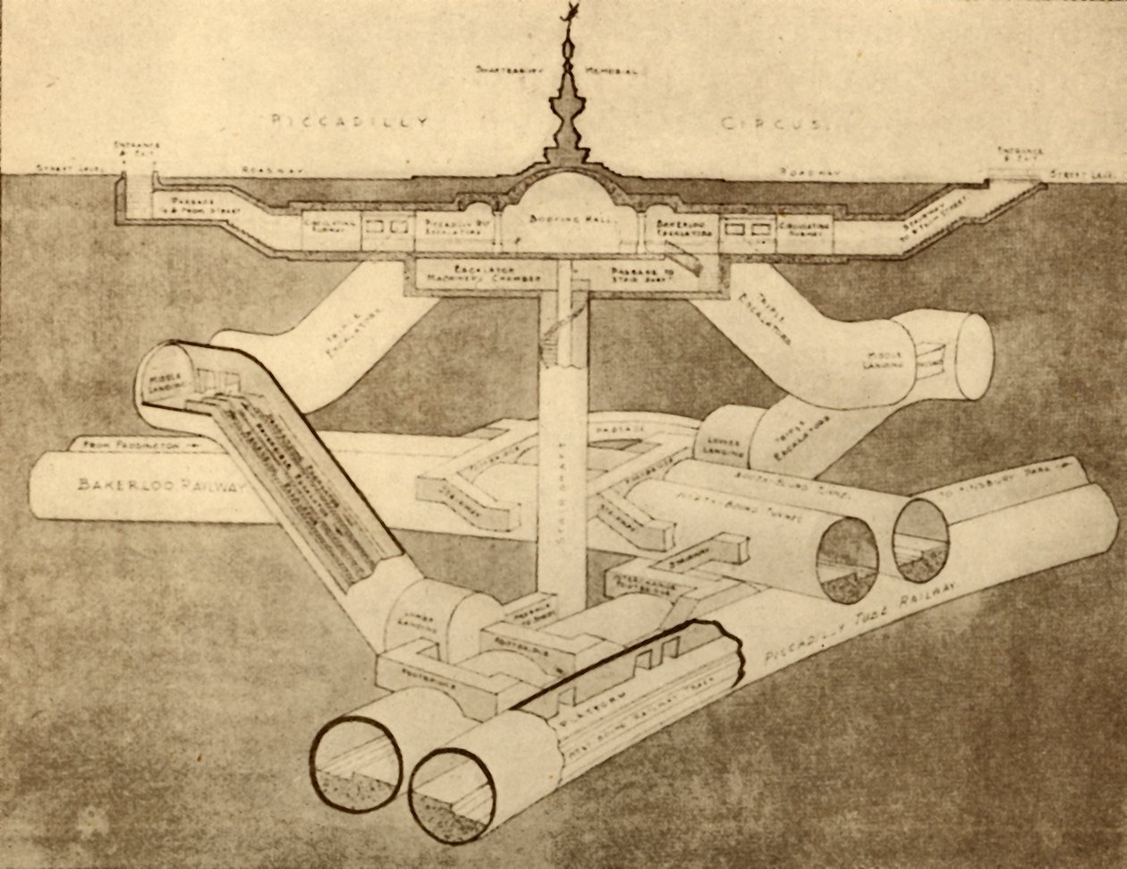 transport · transport · gleise · künste · buch · britisch · gleis · station · piccadilly zirkus · unterirdische station · jahrhundert · großbritannien · diagramm · dreißiger jahre · literatur · querschnitts · einfarbig · querschnitt · london unterirdisch · schwarzes u. weiß · schwarzes und weiß · dreißiger jahre · 20. jahrhundert · unknown · piccadilly line · ward lock co · ward lock · harry golding · golding · harry · underground railway · the wonder book of railways · The Print Collector/Heritage Images |