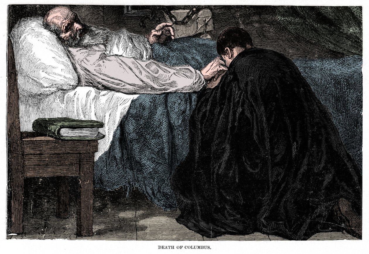 italien · italienisch · leute · mann · mann · männer · gealtert · land · kerl · bett · schlafzimmer · raum · farbe · farbe · sterben · älter · position · jahrhundert · forscher · konzept · leid · navigation · nautiker · sorgen machen · colourised · 19. jahrhundert · 16. jahrhundert · 19.jahrhundert · sechzehntes jahrhundert · christopher columbus · engraving · portrait · unknown · christopher · columbus · john gilmary shea · shea · john gilmary · cristobal colon · bed chamber · colorised · The Print Collector/Heritage Images