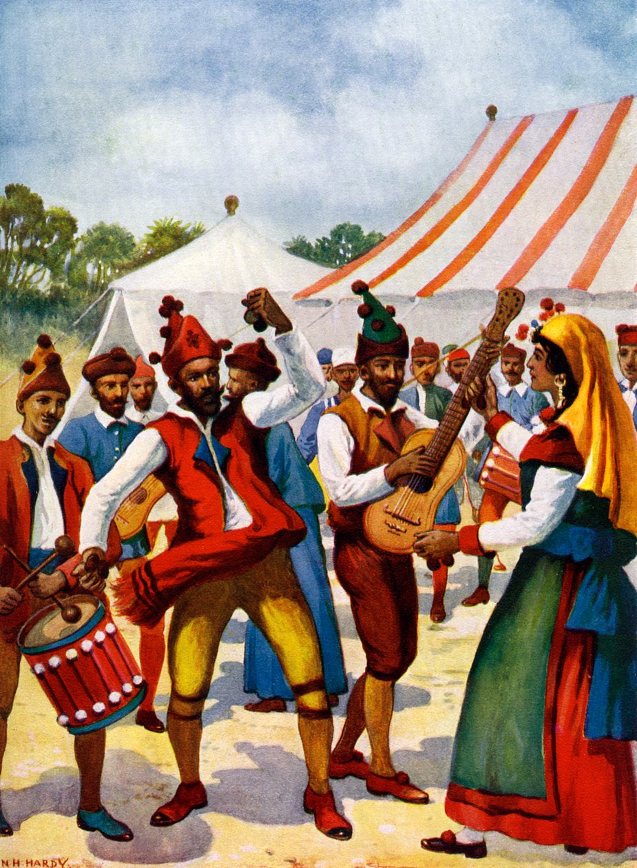 frau · frauen · frau · leute · mann · mann · männer · musik · künste · land · unterhaltung · spanien · spanisch · musiker · kerl · kostüm · trommel · schlagzeuger · kleidung · headdress · farbe · farbe · bunt · kleid · guitarre · traditionelles kostüm · zelt · zelte · position · musikinstrument · dame · kopfbedeckung · gitarrist · zigeuner · zigeuner · unknown · norman h hardy · hardy · norman h · The Print Collector/Heritage Images