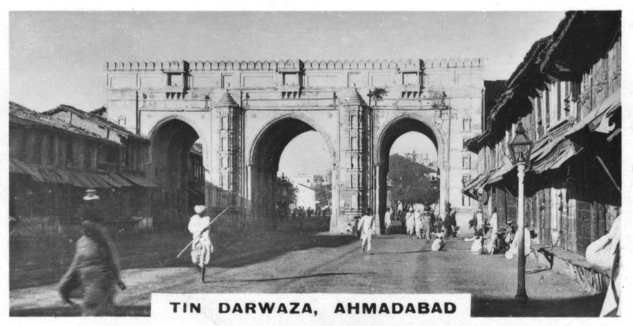außen · straße · gebäude · gebäude · indien · architektur · torbogen · bogen · straße · land · allee · einfahrt · position · jahrhundert · draußen · zwanziger jahre · einfarbig · sammelbar · architektonische eigenschaft · schwarzes u. weiß · schwarzes und weiß · zwanziger jahre · 20. jahrhundert · ahmadabad · gujarat · indian empire · tin darwaza · photograph · landscape · unknown · The Print Collector/Heritage Images |