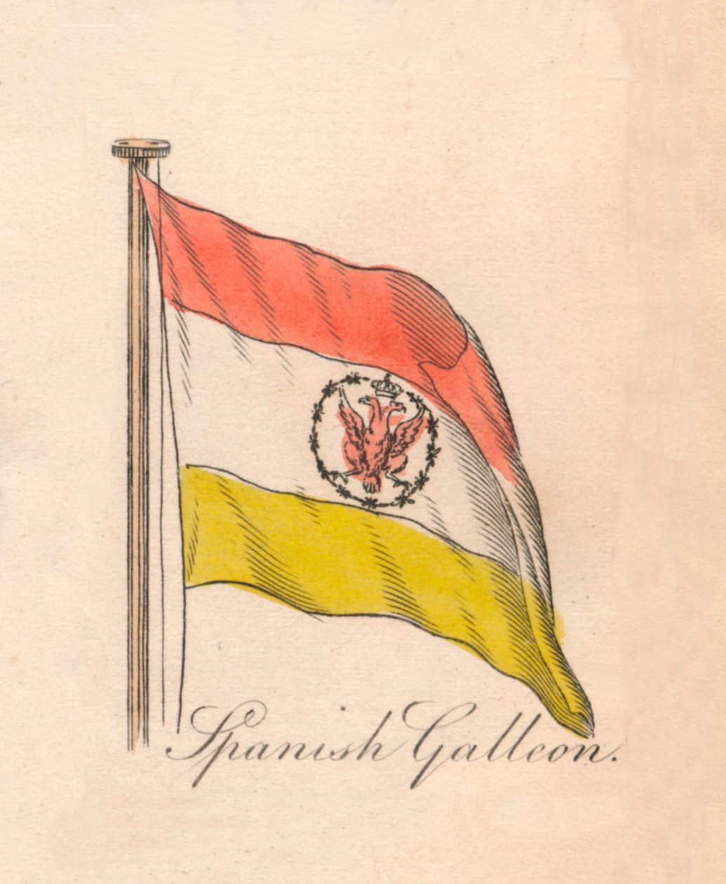 transport · transport · gelb · markierungsfahne · markierungsfahnen · vogel · vögel · land · spanien · spanisch · adler · weiß · nationalität · farbe · farbe · design · streifen · marine · nautisch · krieg · position · jahrhundert · fahne · hoheit · identität · konzept · galleon · marine · standard · kriegsführung · stich · emblem · marinekriegsführung · 19. jahrhundert · wassertransport · 19.jahrhundert · engraving · unknown · fisher · son co · co · fisher · The Print Collector/Heritage Images |