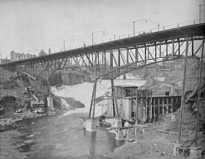 außen · draußen · fluß · gealtert · wasserfall · künste · technik · land · fall · energie · buch · brücke · brücken · ansicht · geographie · washington · struktur · neue welt · position · jahrhundert · vista · verdammung · literatur · konzept · natürliche phänomene · spokane · spokane fluß · katarakt · einfarbig · amerikanischer westen · vereinigte staaten von ameri · hydroelektrizität · hydroelektrische energie · 19. jahrhundert · schwarzes u. weiß · schwarzes und weiß · 19.jahrhundert · amerikanisch · geschichte · historisch · amerika · photograph · unknown · cromwell · george · george cromwell · professor george cromwell · professor george r cromwell · george r cromwell · spokane falls · tour through the new world america · george r · geo r cromwell · cn greig co · cn greig · monroe street dam · The Print Collector/Heritage Images
