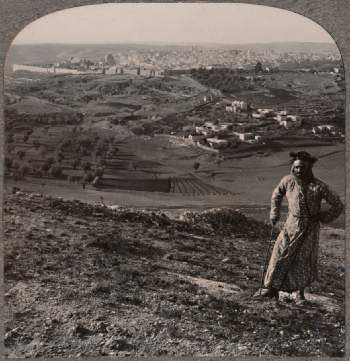 spielraum · szenisch · portrait · stehen · hügel · leute · mann · mann · männer · landschaft · berg · berge · land · kerl · geographie · jerusalem · israel · cityscape · position · jahrhundert · konzept · eine person · touristische anziehung · einfarbig · publikation · palästina · schwarzes u. weiß · schwarzes und weiß · lokale leute · 1900s · 20. jahrhundert · verleger · tourismus · direct gaze · photograph · stereocard · unknown · journey in all lands · realistic travels · stereocard · realistic travels publishers · mount scopus · The Print Collector/Heritage Images |