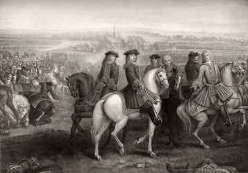 deutschland · tier · leute · mann · mann · männer · tiere · pferde · pferd · fromm · land · französisch · frankreich · religion · bayern · kerl · britisch · kirche · kämpfen · christentum · angebracht · krieg · position · jahrhundert · großbritannien · personal · allgemein · soldaten · soldat · zu pferde · konzept · schlacht · einfarbig · armee · kriegsführung · kommandant · schlachtfeld · schwarzes u. weiß · schwarzes und weiß · militärisches personal · 18. jahrhundert · achtzehntes jahrhundert · john churchill · duke of marlborough · lithograph · unknown · john · queen of great britain and ireland · duke of · anne of · anne of denmark · denmark · queen anne · louis · anne · churchill · duke of marlborough · marlborough · louis laguerre · laguerre · The Print Collector/Heritage Images