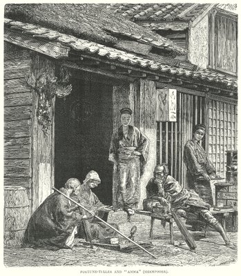 Die Schwelle eines Dorfgasthauses in Japan, die Wirtinnen dienen als Gastgeber für ihre Stammgäste. Gravur zur Illustration der Reise nach Japan in den Jahren 1863-1864, von Aime Humbert, Minister der Schweizerischen Eidgenossenschaft, in „Le tour du monde(The threshold of a village inn in Japan, the hostesses serve as the host for their habitual guests. Engraving to illustrate the voyage to Japan in 1863-1864, by Aime Humbert, minister of the Swiss Confederation, in “Le tour du monde, nouveau journal des vo)Unknown artist |