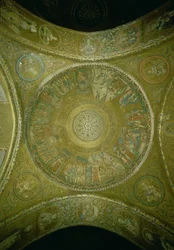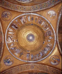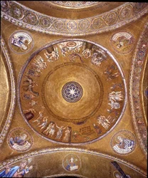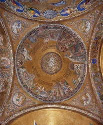 Ansicht der Kuppel mit Mosaiken auf goldenem Hintergrund (romanischer und byzantinischer Stil), die das Leben von Moses darstellen. In den Pendentifs die vier Propheten Salomo, David, Sacharja, Maleachi. San Marco Basilika(View of the dome with mosaics on a golden background (Romanesque and Byzantine style) illustrating the life of Moses. In the pendants, the four prophets Solomon, David, Zechariah, Malachi. The beginning of the 13th century. Basilica San Marco (Basilica of )Veneto-Byzantine School |