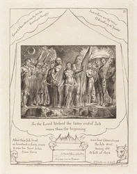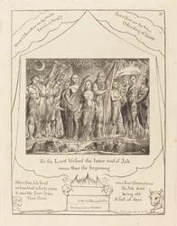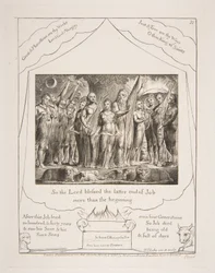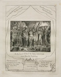 natur · tier · baum · england · leute · paare · fromm · betrieb · betriebe · künste · land · verbindung · religion · kunst · schafe · britisch · feiern · englisch · feier · feiern · christentum · judentum · jüdisch · position · jahrhundert · großbritannien · wohlstand · biblisch · konzept · frauen · frau · ehemann · wiederherstellung · altes testament · 19. jahrhundert · schwarzes u. weiß · schwarzes und weiß · wieder hergestellt · 19.jahrhundert · buch des jobs · bäume · engraving · william blake · blake · william · heritage art · print · Heritage Art/Heritage Images
