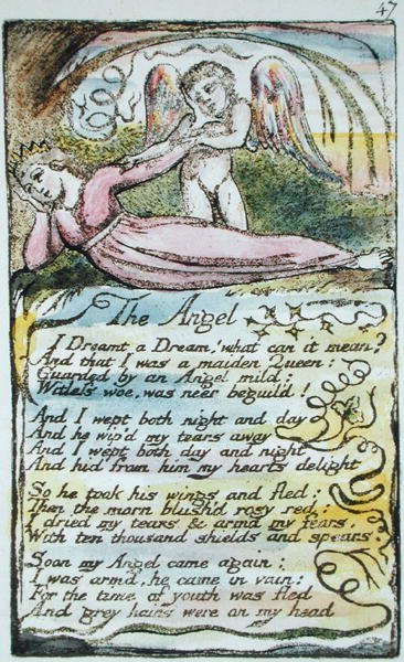 Der Engel, Platte 47 (Bentley 41) aus Songs of Innocence and of Experience (Bentley Copy L) 1789-94(The Angel, plate 47 (Bentley 41) from Songs of Innocence and of Experience (Bentley Copy L) 1789-94 (raised etching with pen & wc))William Blake |