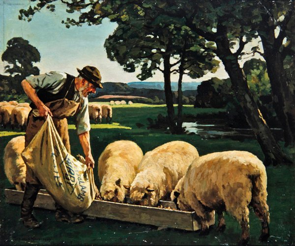 landwirtschaft · landwirtschaft · bauernhof · ranch · essen · essen · essen · essen · essen · bauer · landschaft · landschaft · fluss · trog · herde · idylle · landschaft · landwirtschaft · männchen · schafe · füttern · vieh · malerei · mzpainting · Private Collection / Bridgeman Images |