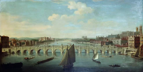 westminster bridge · westminster hall · westminster abbey · themse · london · lambeth palace · suffolk house · aussicht · fluss · boote · segelboote · handel · transport · verkehr · 18. jh. · stadt · themse · stadtbild · architektur · bögen · häuser · zivil maschinenbau · Private Collection / Bridgeman Images